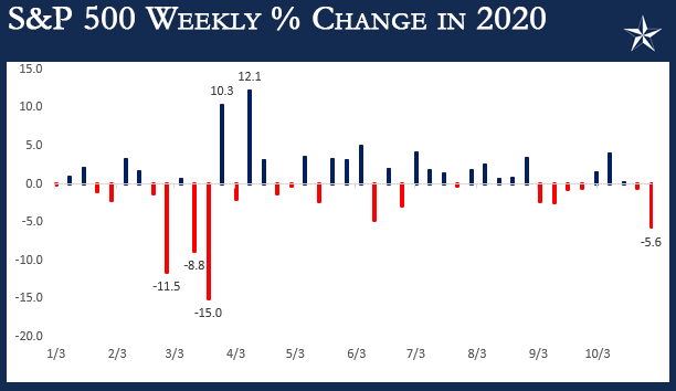 We devoted a good section of October’s Timely Topics to help educate clients about selling out of fear. Why? From conversations with clients, we could hear fear on the horizon. Between rising COVID cases around the country, pending election, and lackluster reactions to solid earnings reports, there were more than a few concerns on the minds of investors heading into the last two months of the year. Fast forwarding a few weeks, the S&P 500 finished the last week of October with a decline of 5.6% for the week. As visible from the following chart, this week ranked as the worst week since March and the fourth-worst week of the year.